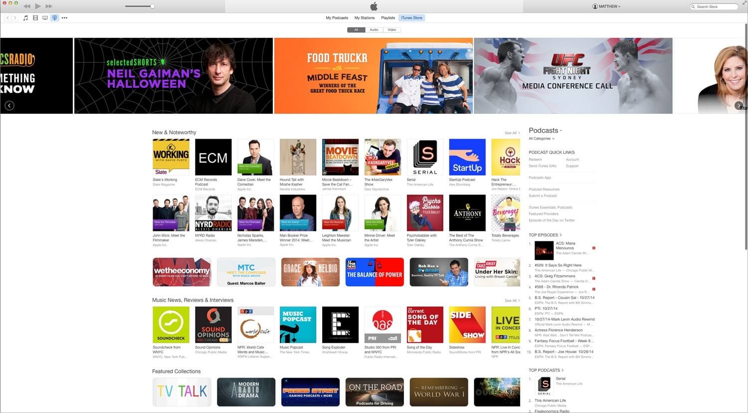 iTunes front page, featuring a wide picture of the FoodTruckr podcast in a carousel, between Neil Gaiman's Halloween and a UFC podcast.